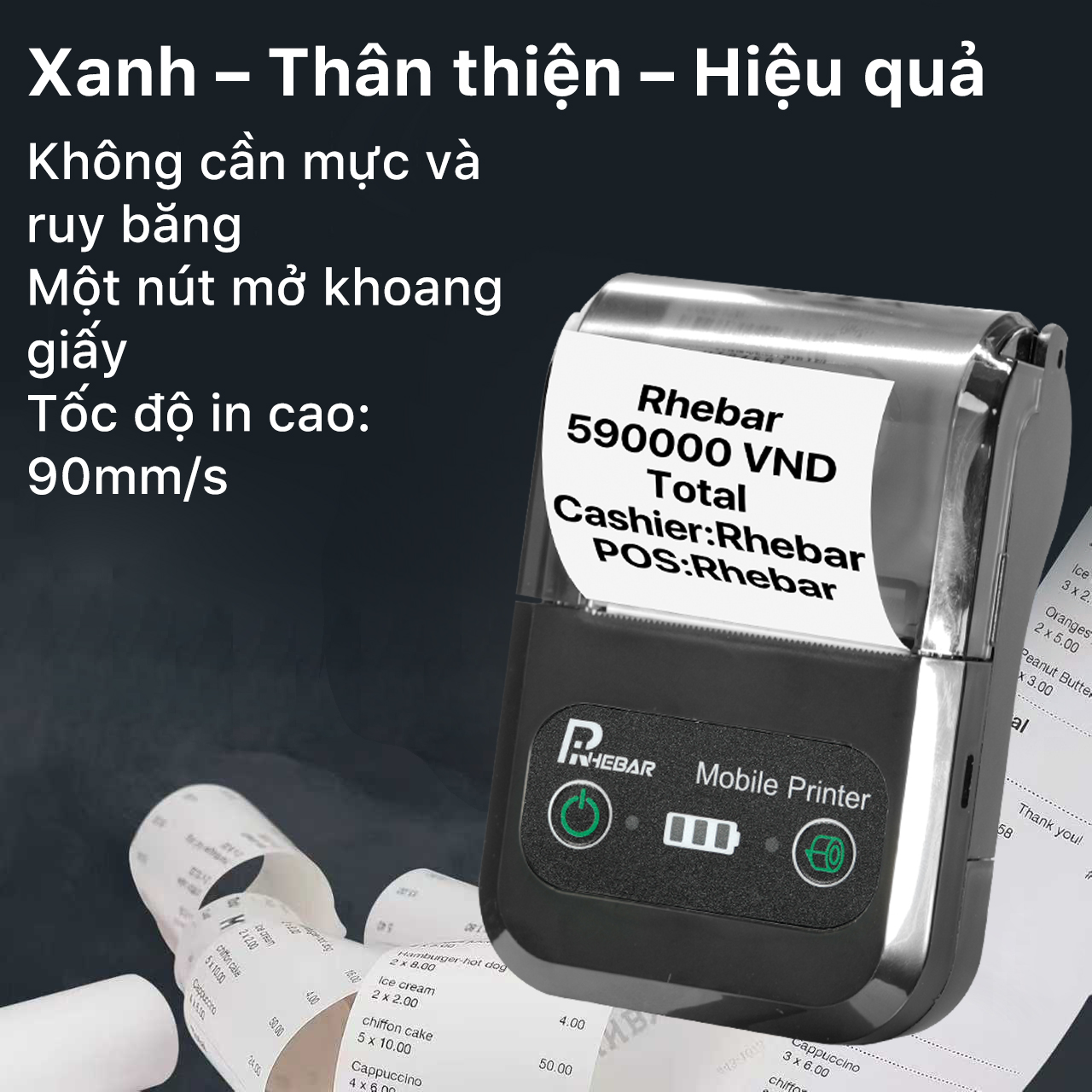 Rhebar Máy In 58mm – In Nhanh 90mm/s, Hóa Đơn Sắc Nét - Hỗ Trợ Mọi POS, In Nhanh – Pin Khủng – Bền Bỉ -In 203dpi - Dễ Sử Dụng